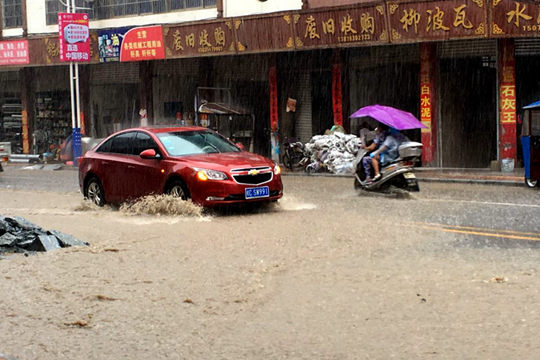 6月4日,几名小朋友在三江侗族自治县良口乡和里村荷塘骑自行车赏花。(摄影:龚普康)