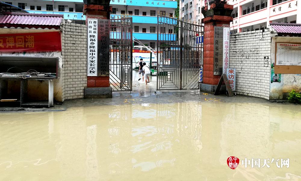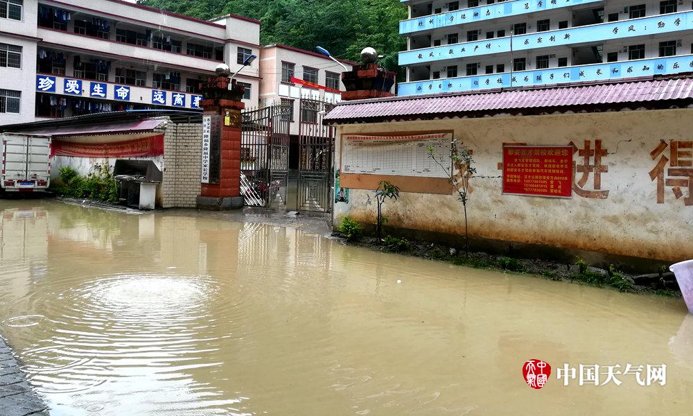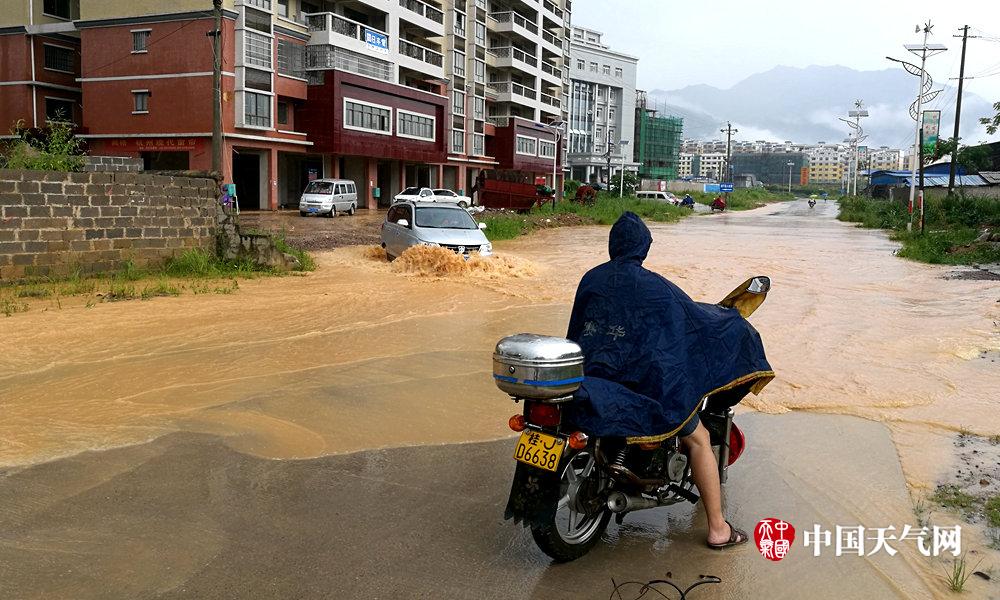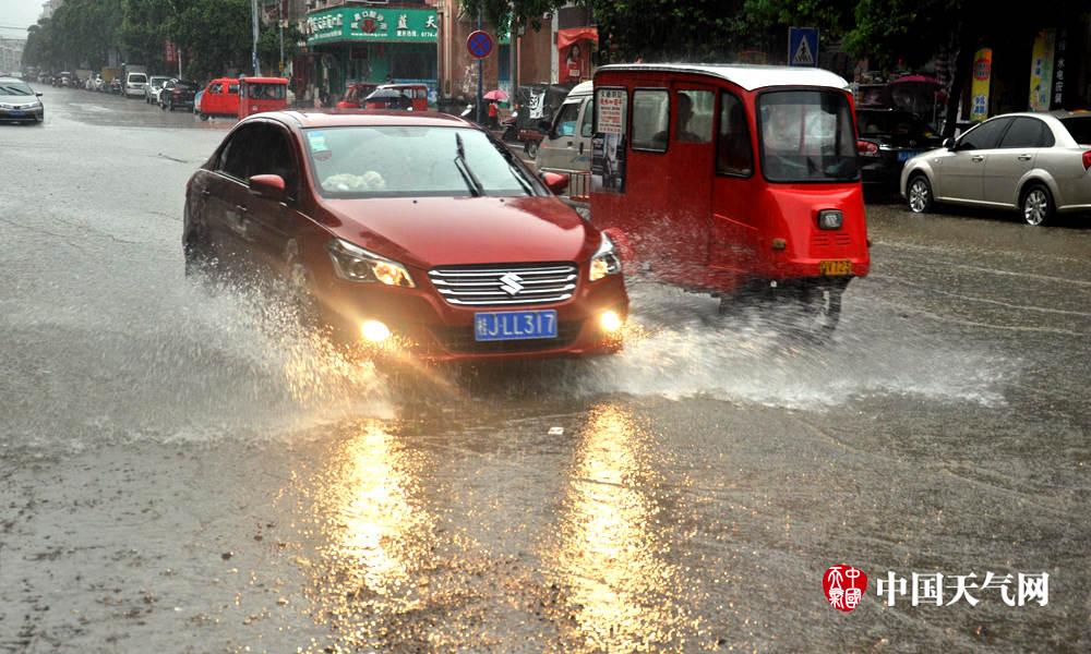 昭平车辆驶过浑浊积水,溅起水浪(摄影:李春晖)