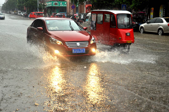 宜州城区低洼路段积水拉起警戒线(摄影:陆德旺)