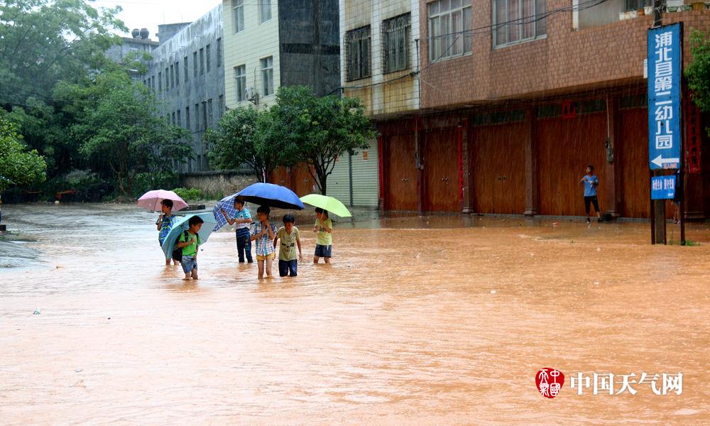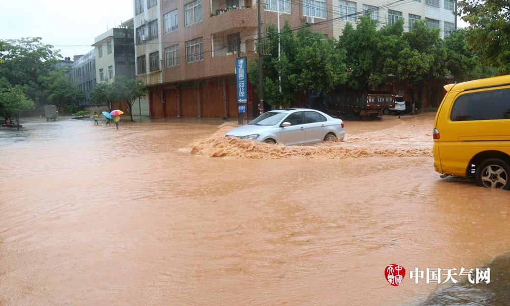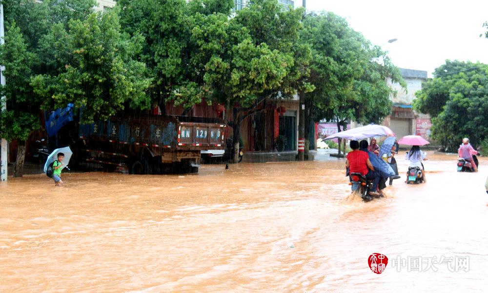 积水严重,行人车辆如在河中行。