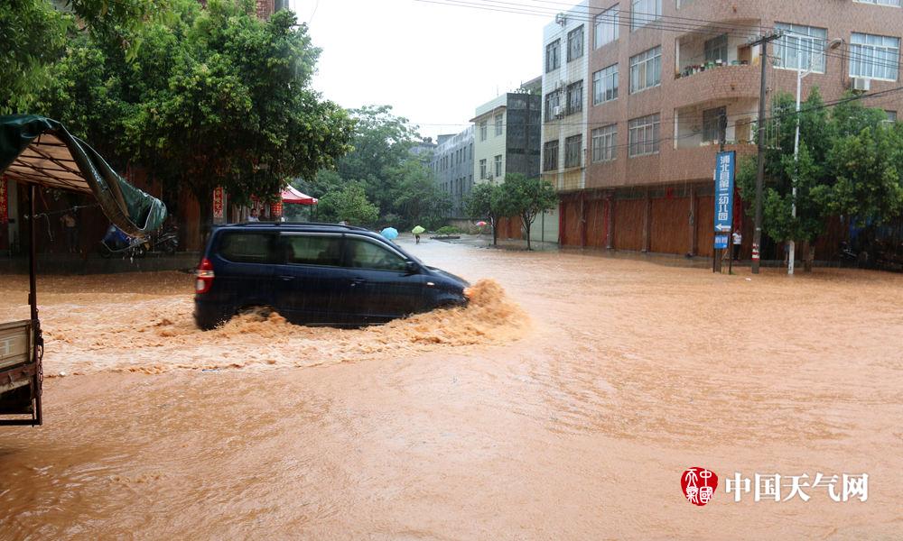 积水没过车轮,车辆行驶艰难。