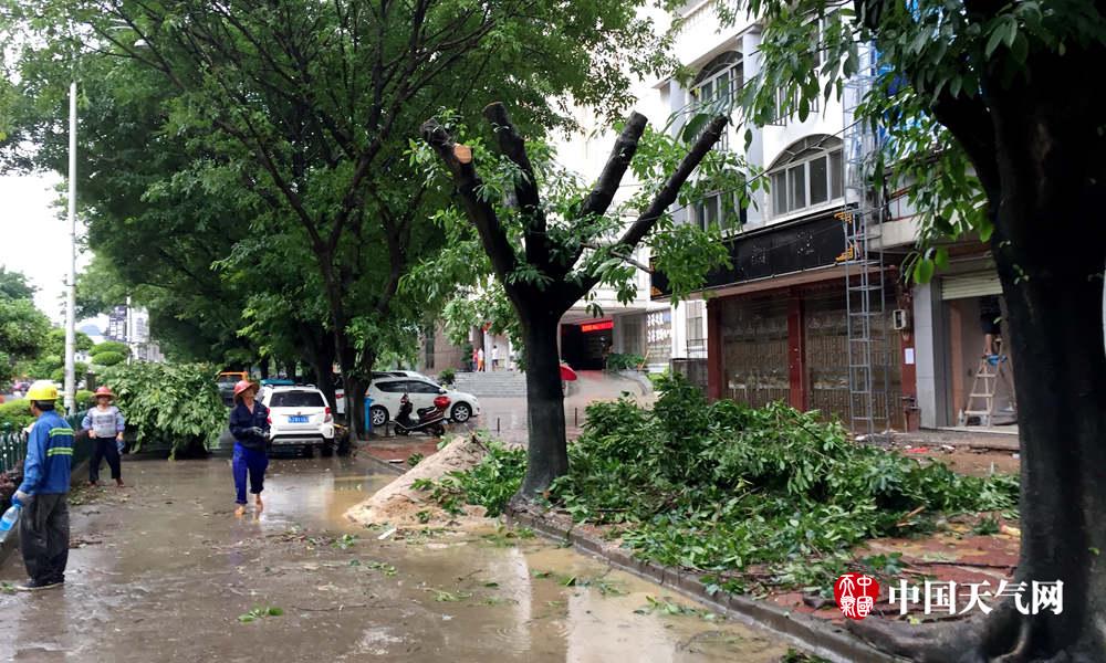 抢修人员在紧急清理被风吹断的树枝(摄影:黄远盼)