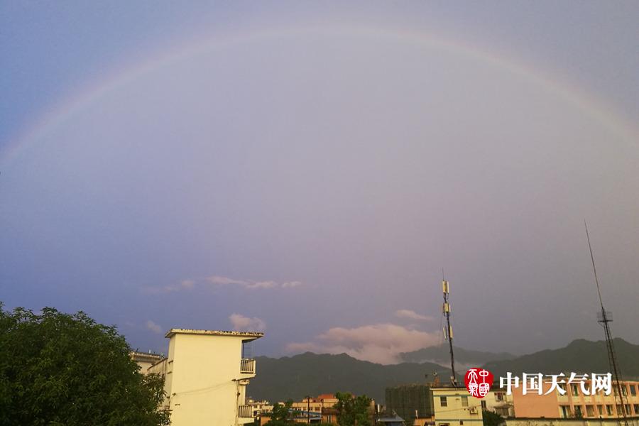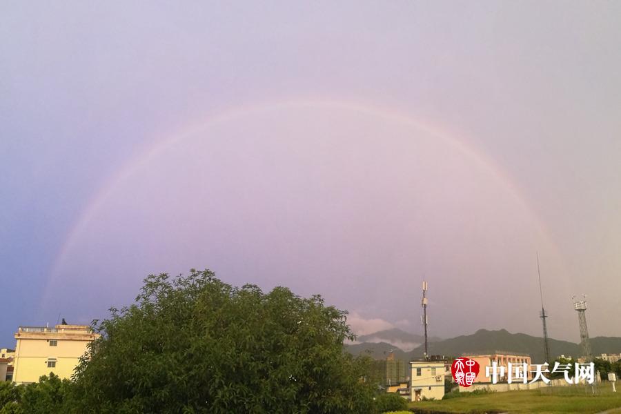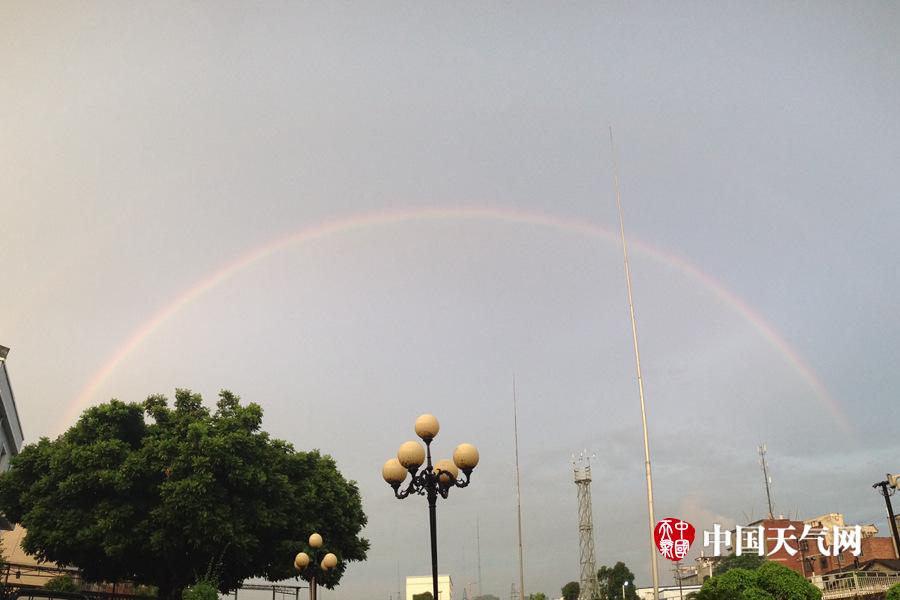 贵港傍晚出现的彩虹呈现完整的半圆形状(摄影:叶小婷)