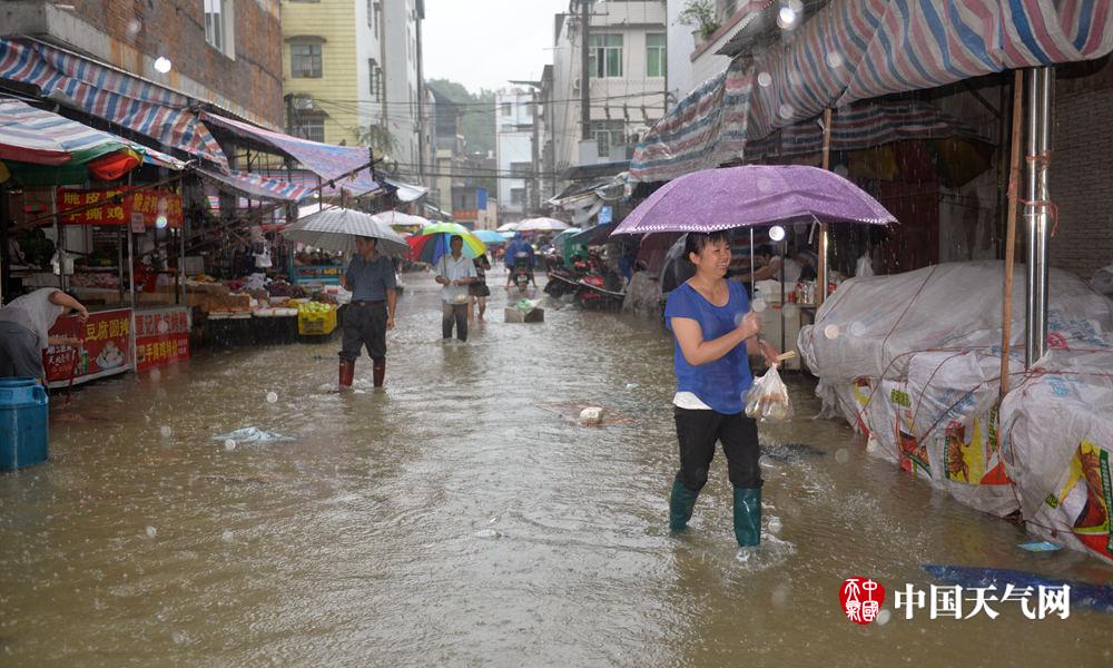居民涉水进入市场(摄影:刘国平)