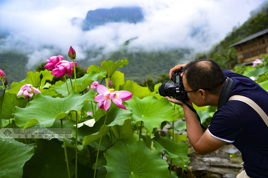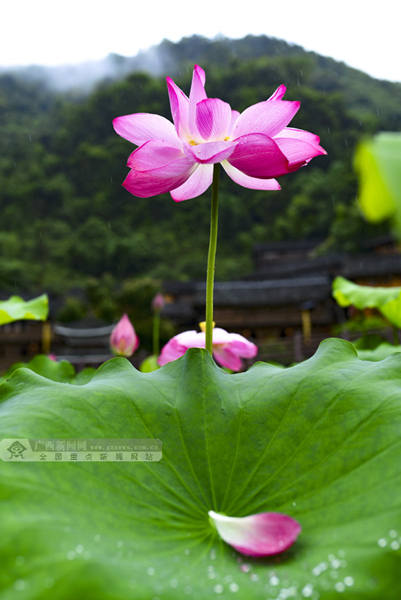 6月15日,游客在广西桂林市龙胜各族自治县泗水乡周家村白面瑶寨观赏荷花。(摄影:潘志祥)