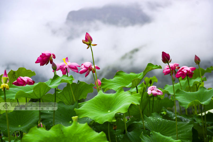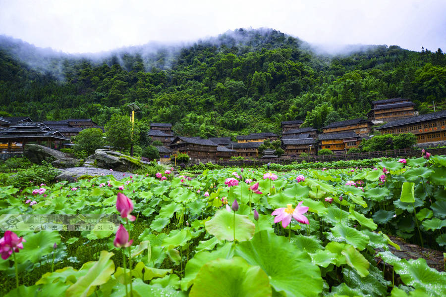 娇艳的荷花与云雾、民居交相辉映,形成了一幅美丽的乡村美景图。(摄影:潘志祥)