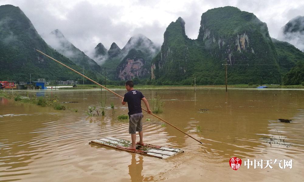 农友划着竹排查看灾情(摄影:廖克峻)
