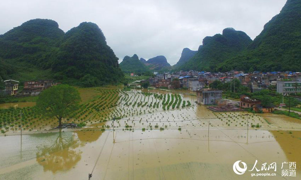 6月26日,在广西柳州市融安县泗顶镇儒南村拍摄被洪水淹没的农田。(摄影:谭凯兴)