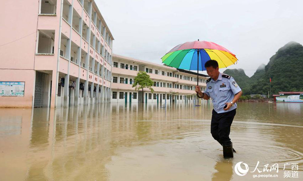 6月26日,在广西柳州市融安县泗顶镇中心小学校园,派出所民警钟居在查看受灾情况。(摄影:谭凯兴)