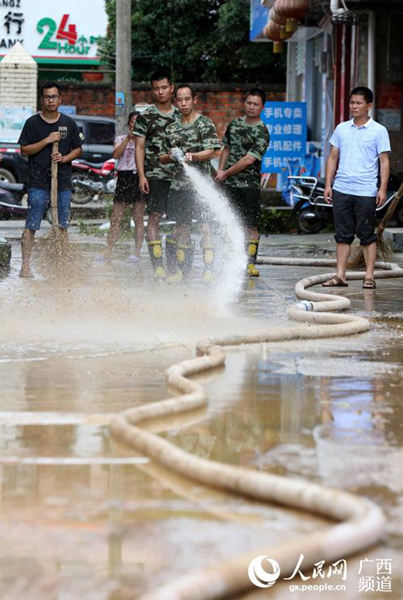 6月26日,在广西柳州市沙子乡沙子街,当地党员干部在清理街道上的淤泥。(摄影:谭凯兴)