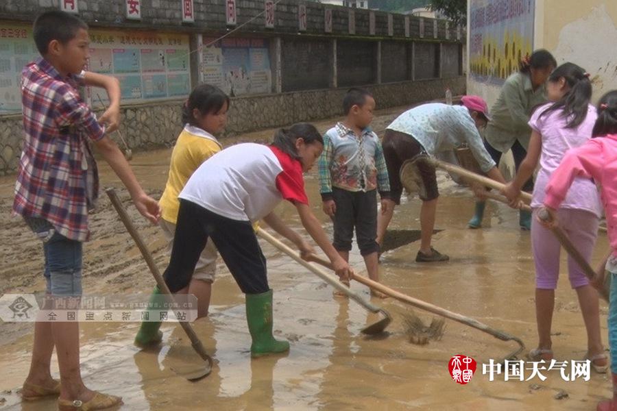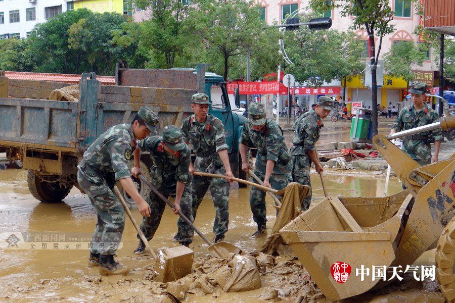 武警官兵、环卫人员等在凤山城区街道清理淤泥。(摄影:李枭)