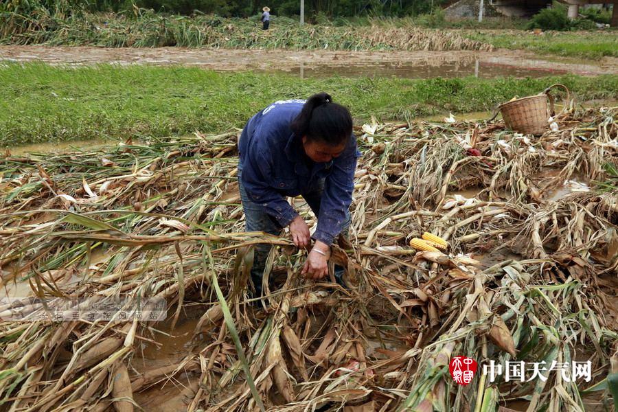 巴烈村村民在清收被洪水淹没过的玉米。(摄影:李枭)