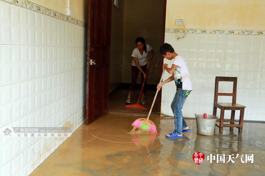 京里村小坡龙屯村民在清理房内淤泥。(摄影:李枭)