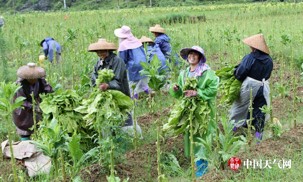 下雨也挡不住他们摘烟叶的步伐。(摄影:梁泽诚)