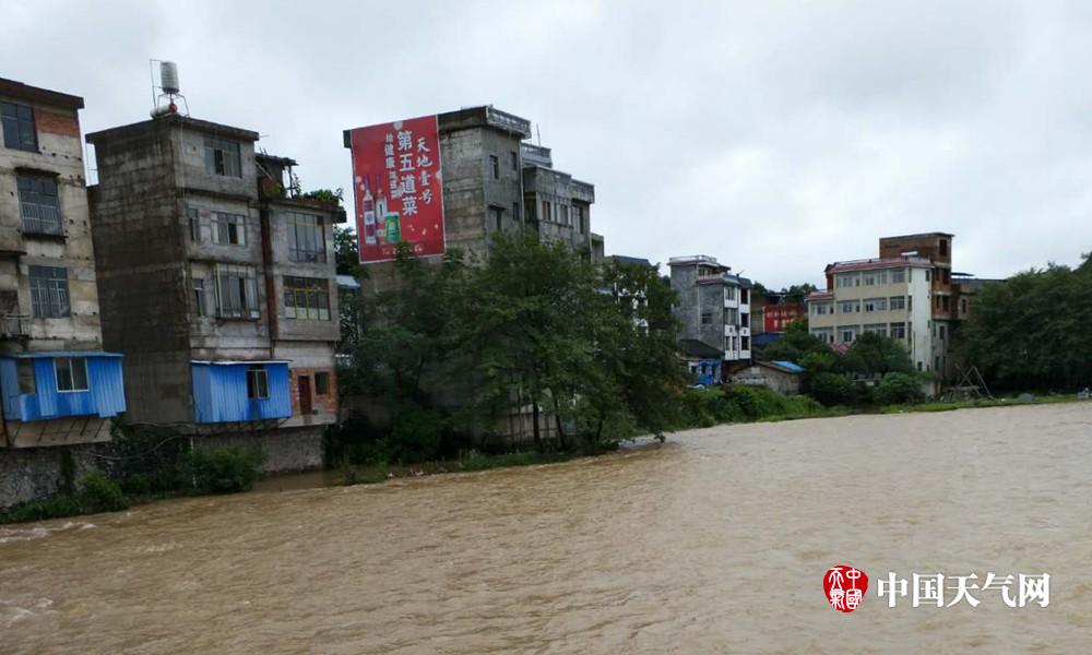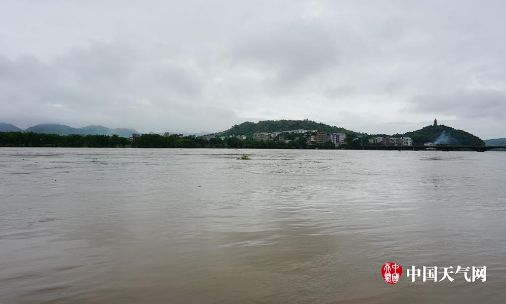 安和镇建江洪水滚滚。(摄影:华琦孜)