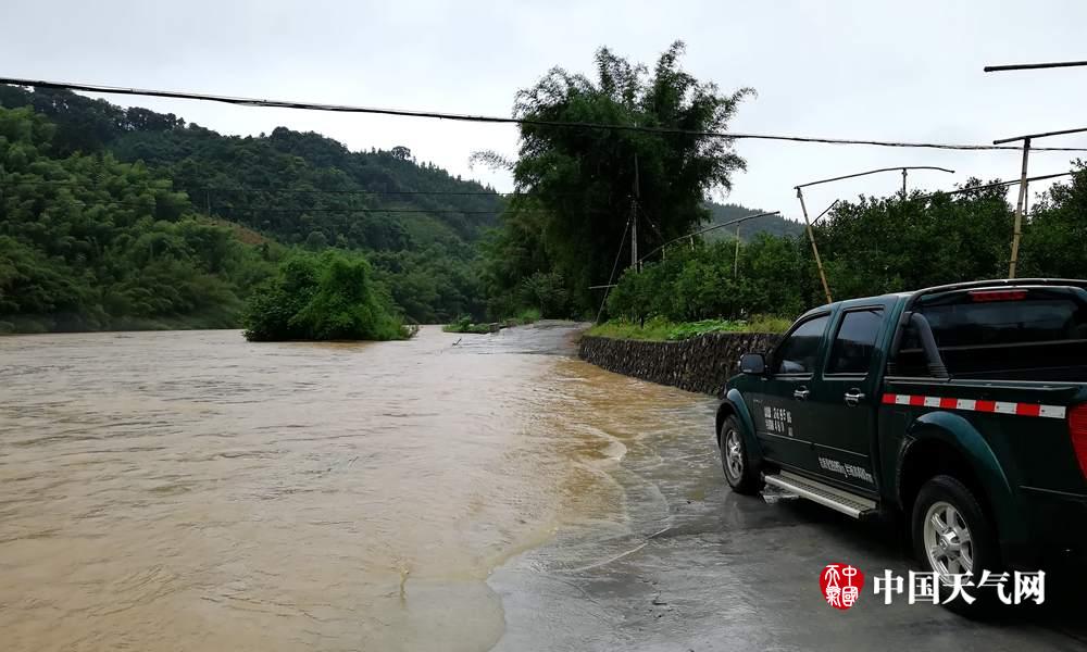 大将镇环城路部分被洪水淹没,车辆无法通行(摄影:郑红)