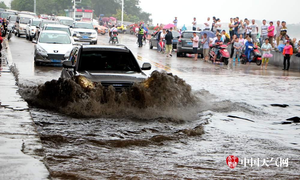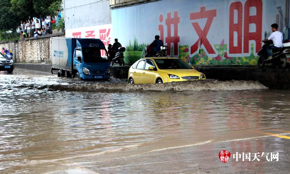 车辆缓慢通过积水(摄影:谭宇)