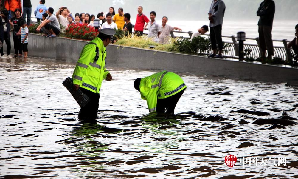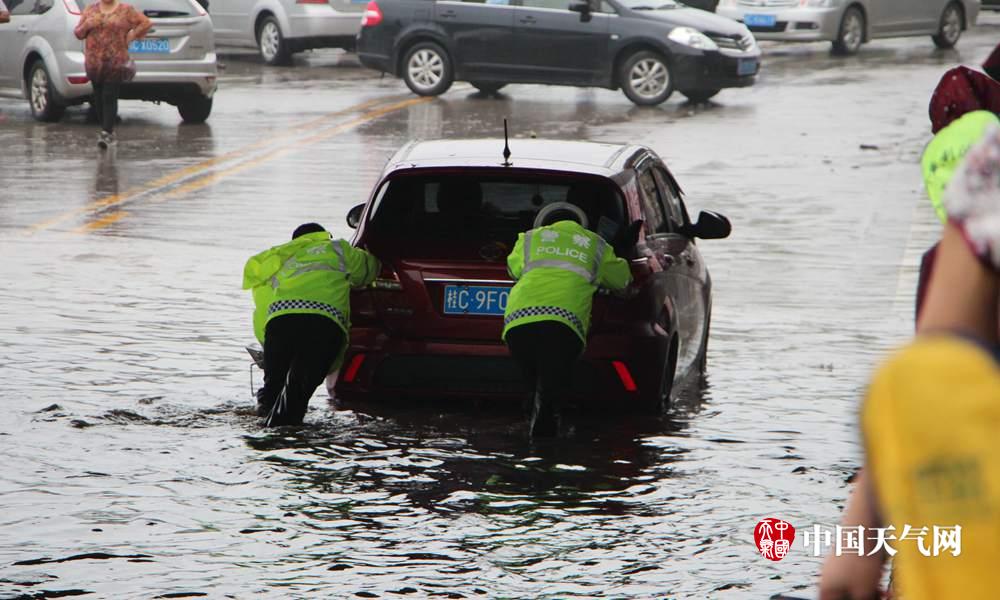 交警将抛锚车辆推离积水(摄影:谭宇)