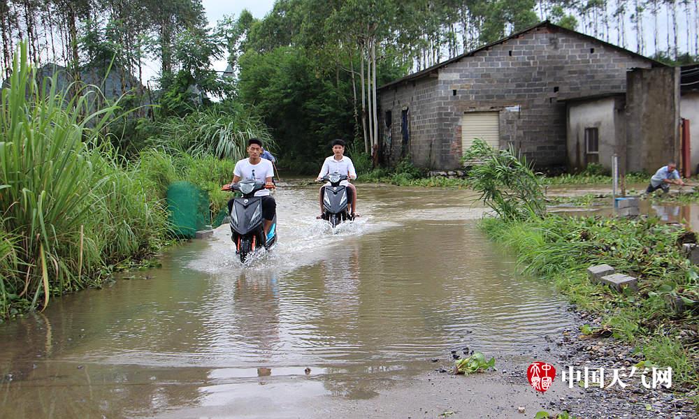 鱼塘水冲到马路中,影响路面车子行驶。(摄影:韦文彬)