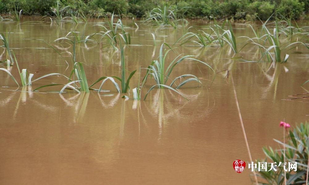 甘庶几乎被洪水淹没,只露出苗头。(摄影:韦文彬)