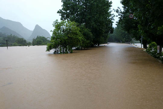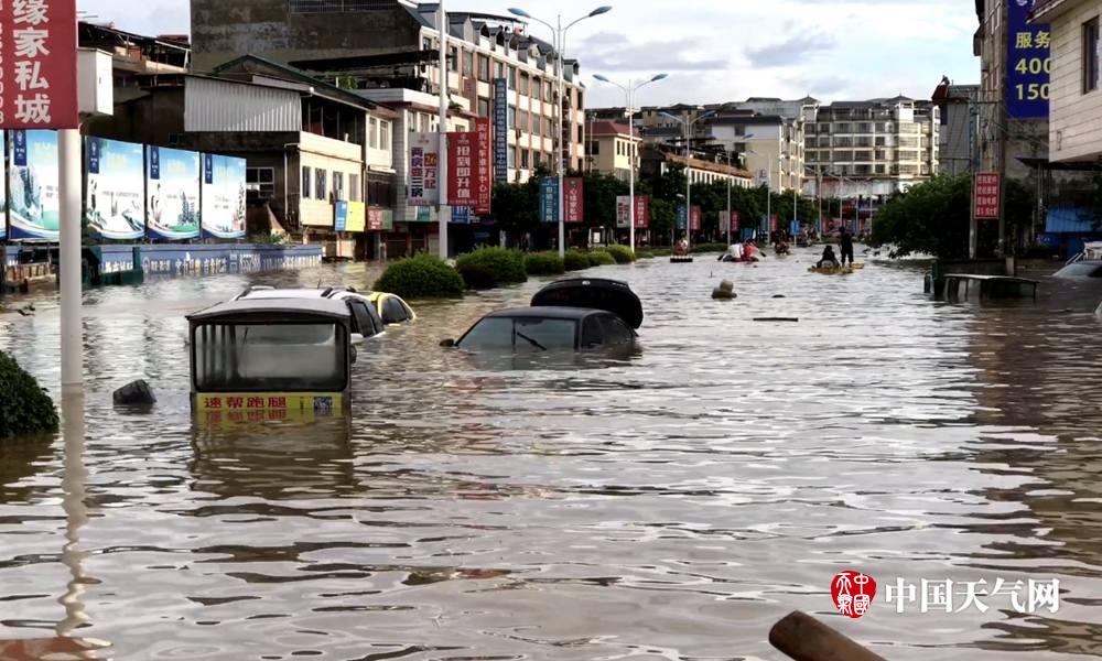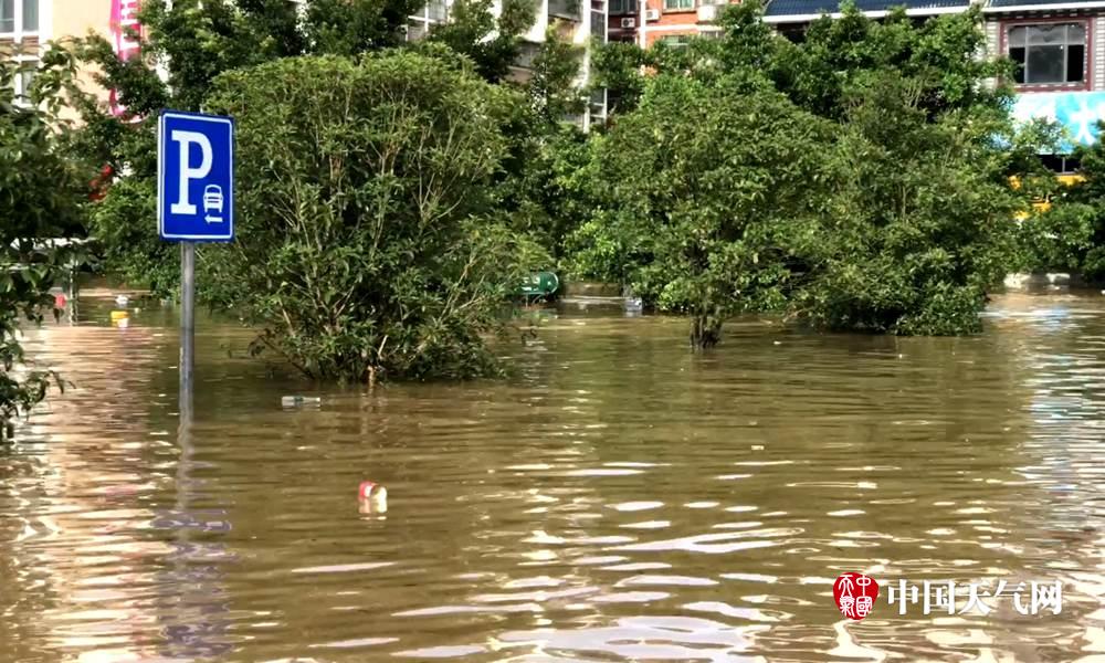 永福县城街道上不时看到被淹没的轿车。(摄影:付发朝)