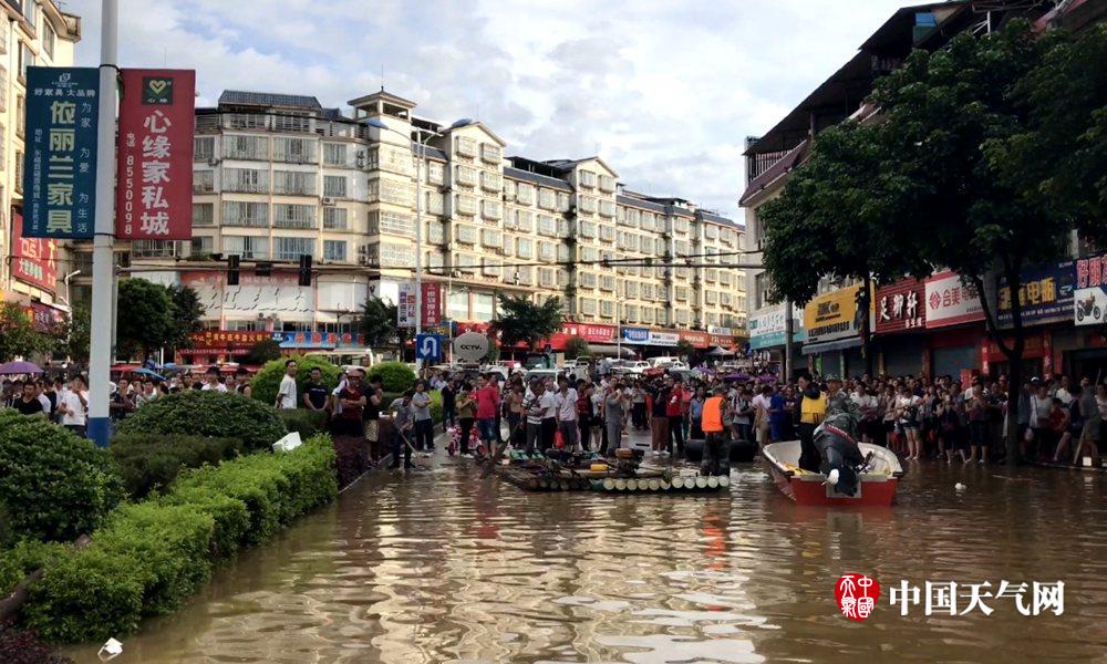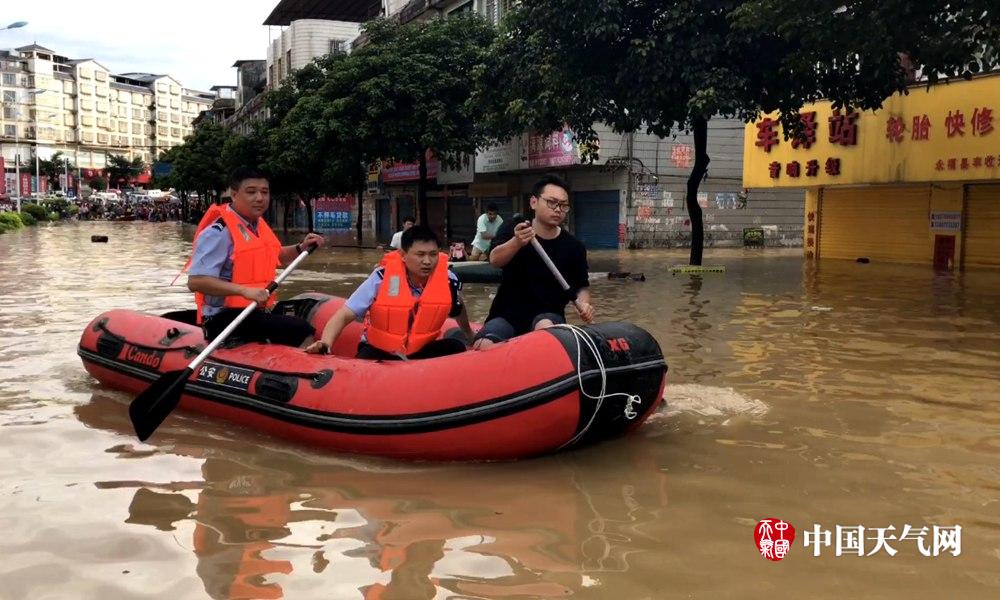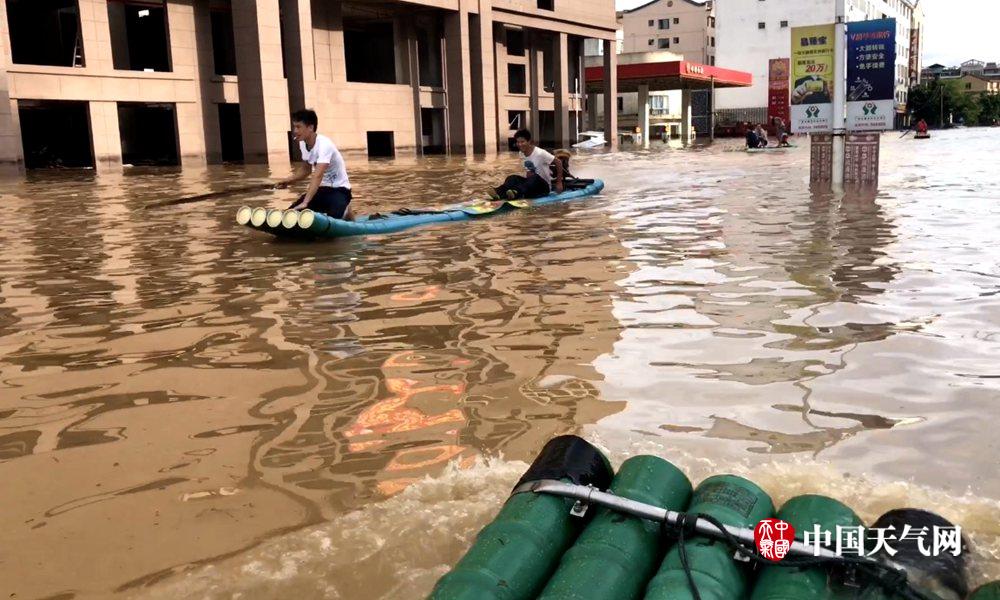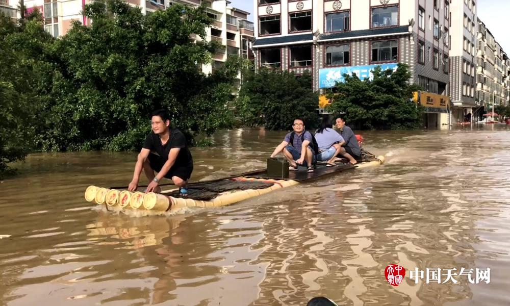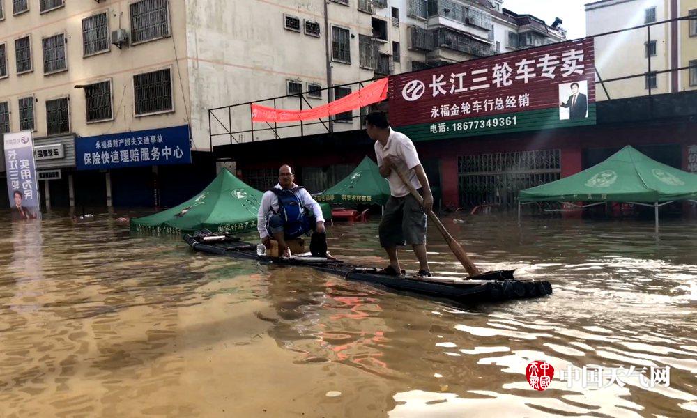 永福县城变“威尼斯”市民出行划竹筏(摄影:付发朝)