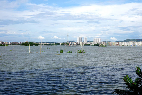 湍急的洪水冲过沿江房屋。(摄影:黄垚焯)