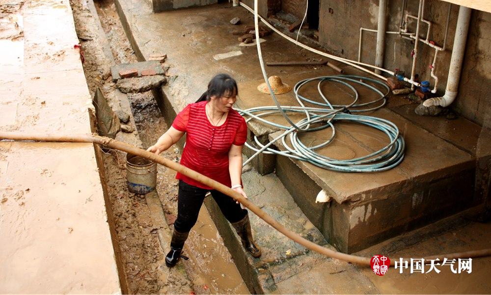 一位大姐拉水管清淤。(摄影:黄垚焯)