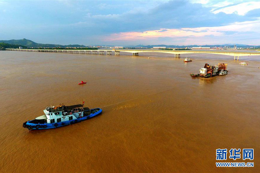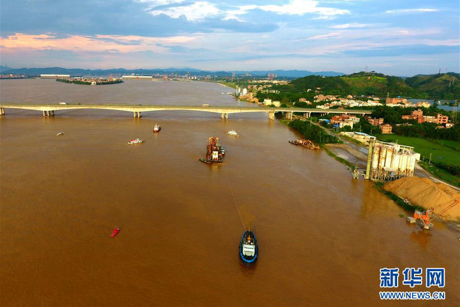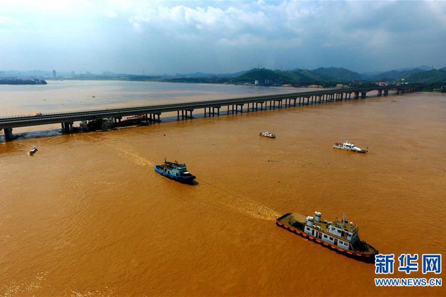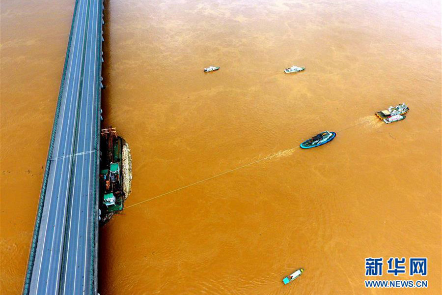 7月5日,拖船尝试将挖沙船从马梧高速浔江特大桥拖离。新华社记者 黄孝邦 摄