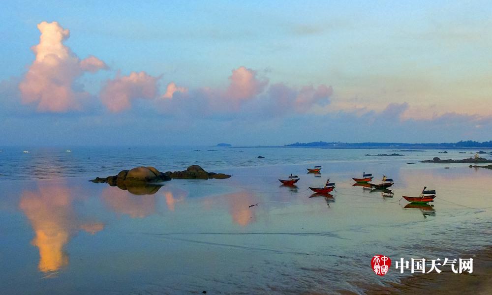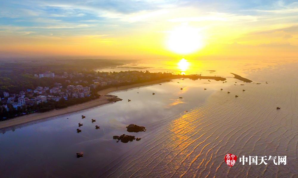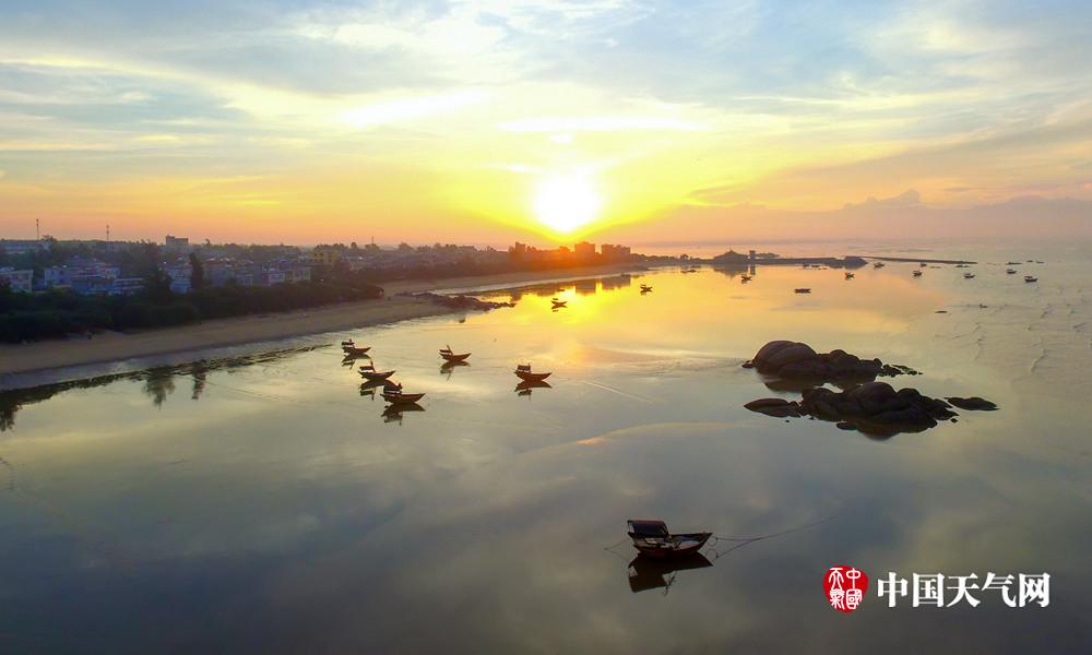 退潮后水平如镜的三娘湾日出美不胜收。(摄影:李斌喜)
