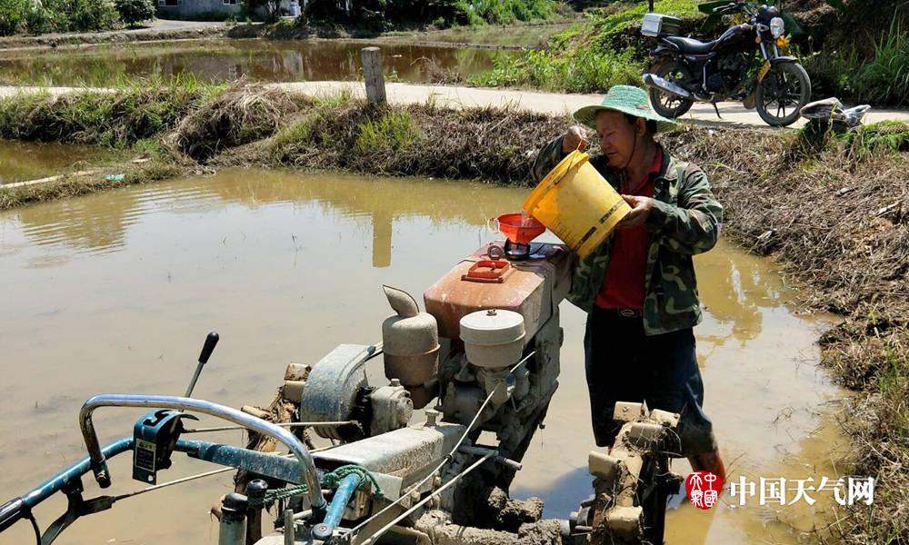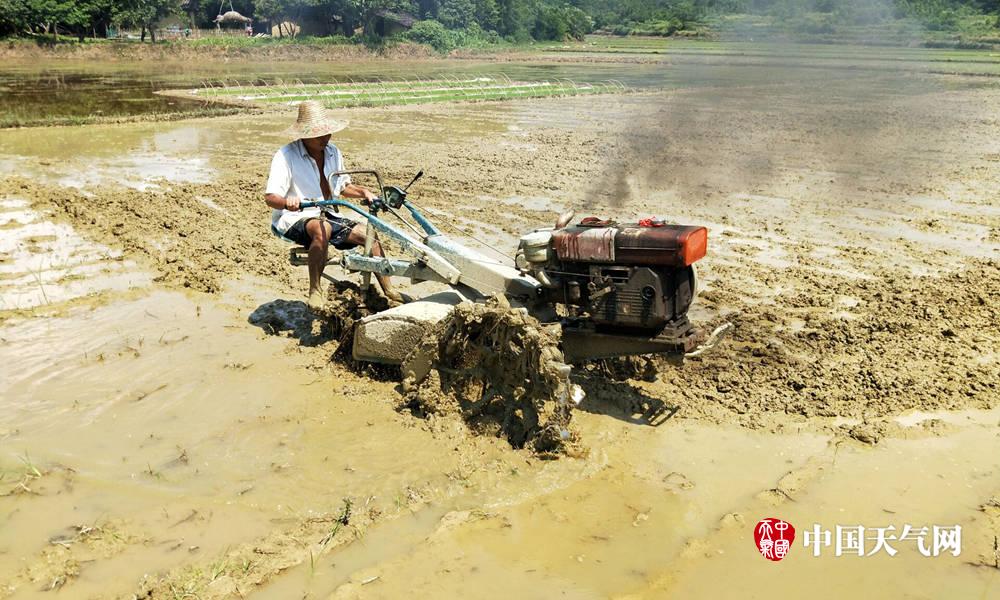防城区那梭镇那夏村竹山组农友在烈日下用农机耙田(摄影:廖汝昌)
