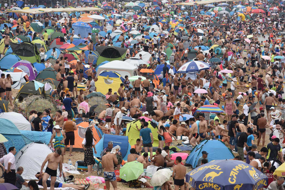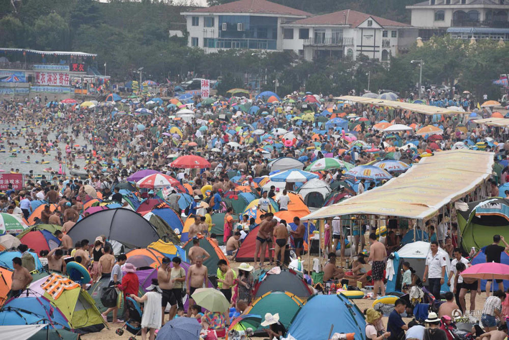 7月29日,辽宁大连,暑夏正热,游客纷至沓来。海滨浴场五彩缤纷、帐篷林立、游人如潮。