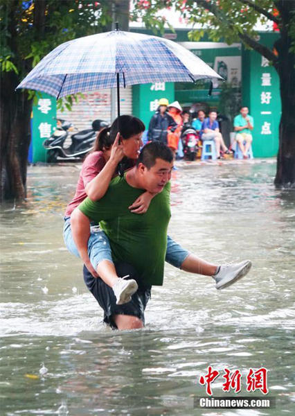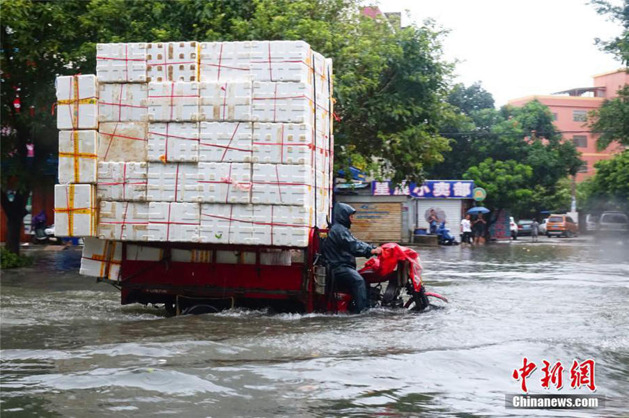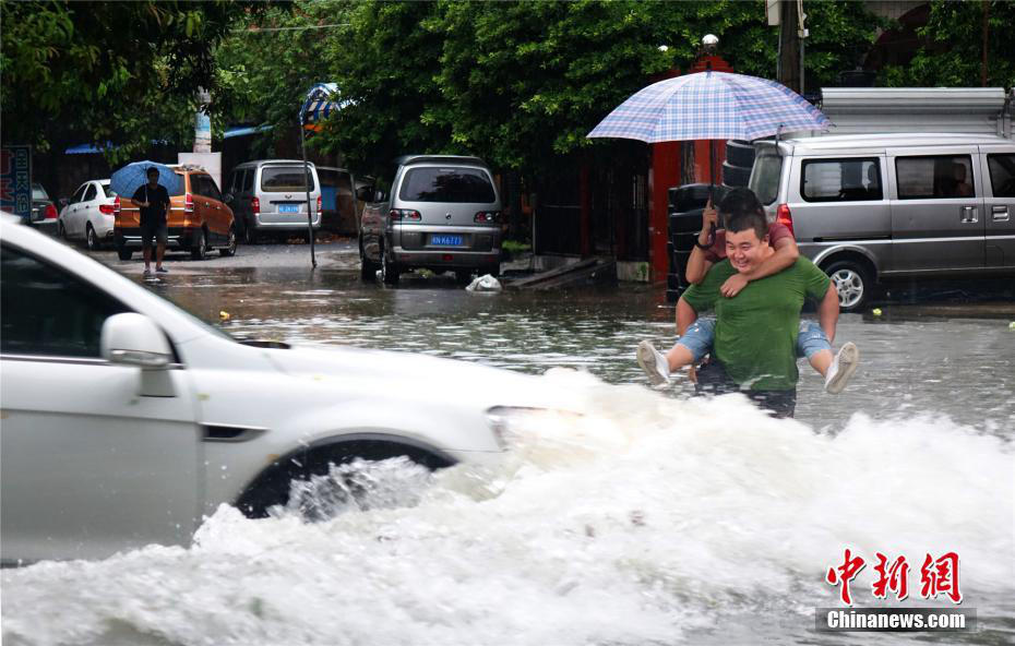 8月3日,广西北海市突降暴雨,市区多处路段出现内涝,民众出行受阻。当地交警、城市排水设施管理处等相关部门深入各内涝、堵点进行疏导或指挥,全力应对暴雨对民众出行造成的影响。(摄影:钟欣)