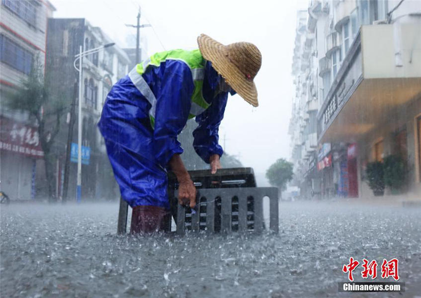 北海市城市排水设施管理处工作人员在排水。(摄影:钟欣)