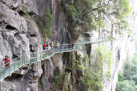 一男子背着一名女子趟水而过。(摄影:钟欣)