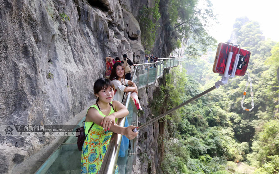 游客在石门仙湖景区玻璃栈道上用手机自拍。(摄影:谭凯兴)