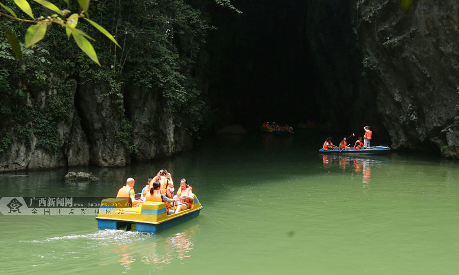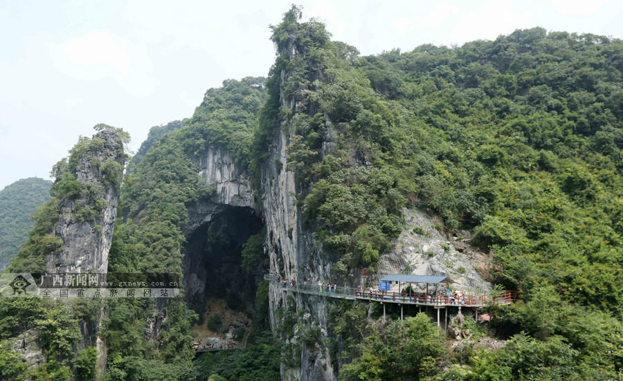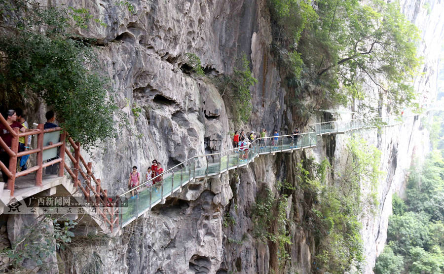 8月1日,游客在柳州市融安县石门仙湖景区玻璃栈道上游玩。(摄影:谭凯兴)
