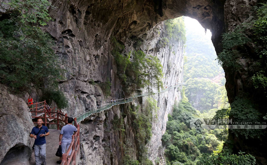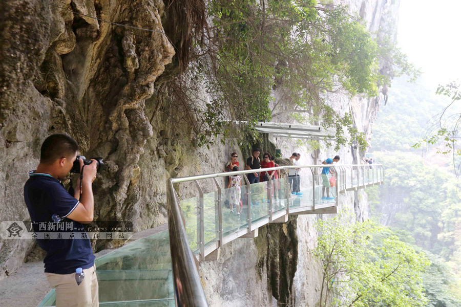游客在石门仙湖景区玻璃栈道上游玩。(摄影:谭凯兴)