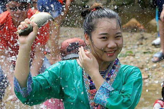 游客拉着树上的绳子从岸边荡到潭里(摄影:叶骏菲)