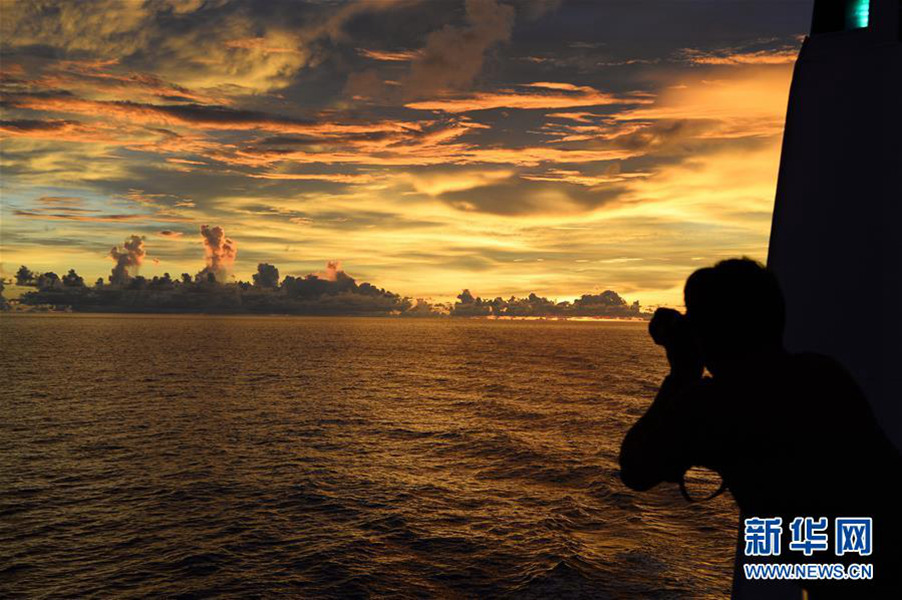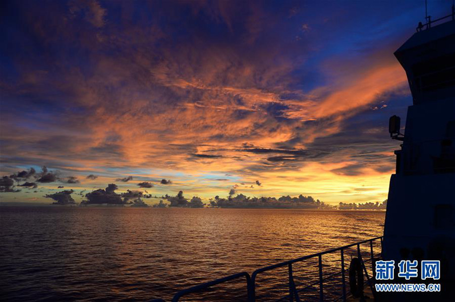 8月10日,我国新一代远洋综合科考船“科学”号在西太平洋行驶途中,遇到金色海上晚霞,景色壮丽。 新华社记者 张旭东 摄
