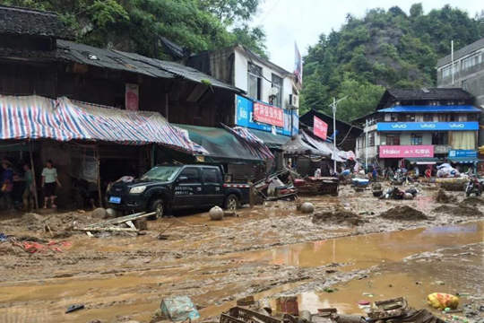 受强降雨影响,柳州融水杆洞乡花雅村在12日早上突发山洪,洪水顺着道路冲刷而下(摄影:李庆庆)