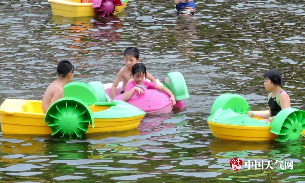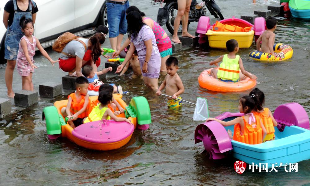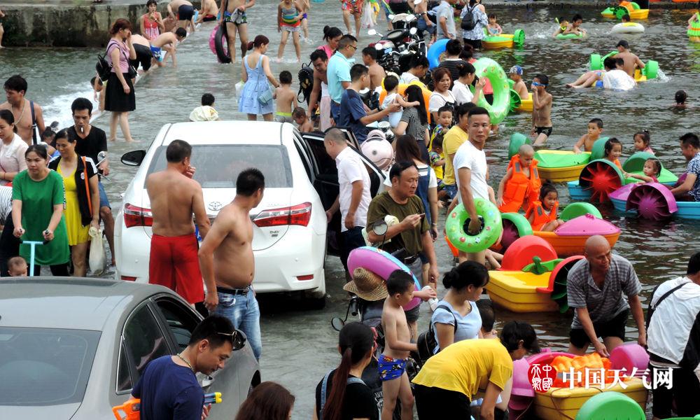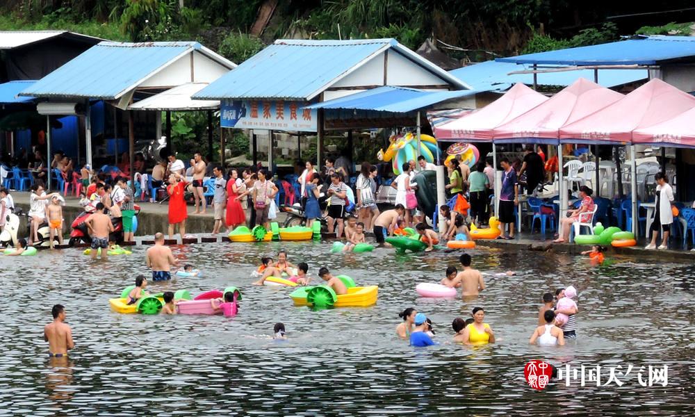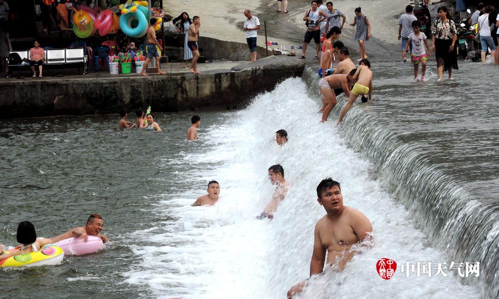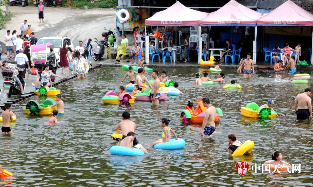 在水里嬉戏的人们享受清凉(摄影:覃俊春)