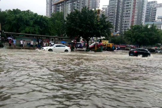 14日下午16时,河池市环江县明伦镇街道变“河道”(摄影:卢丽莉)