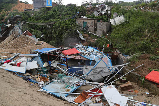 受强风雨影响,贵港高铁站路口一棵大树被吹倒,路边停靠车辆被压,24日上午市绿化管理处工人正加紧清理(摄影:唐鹤云)