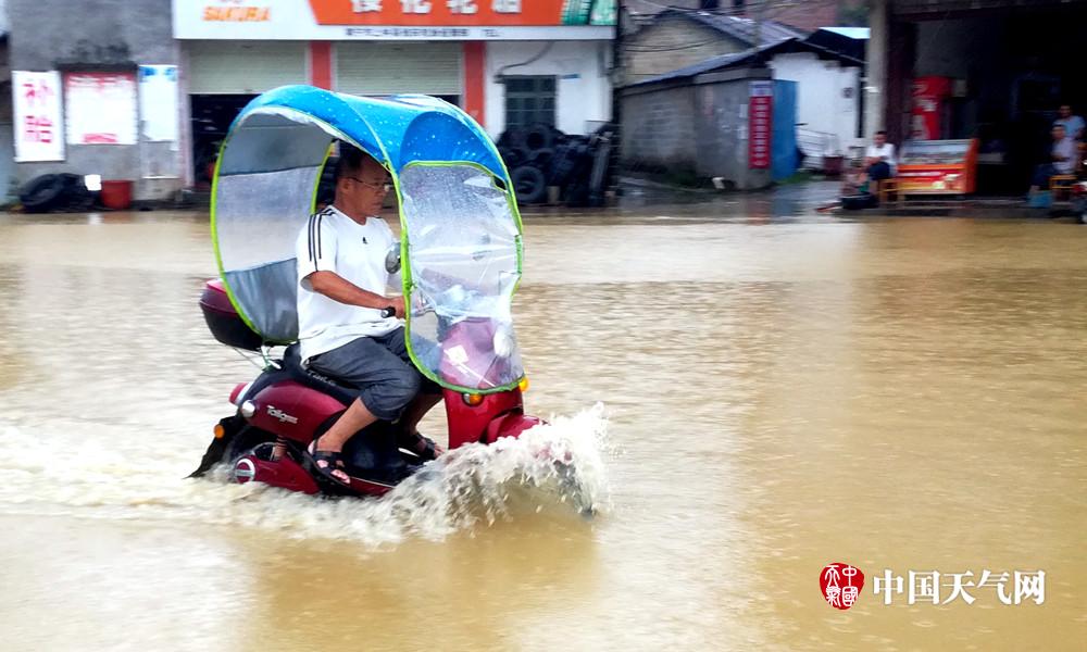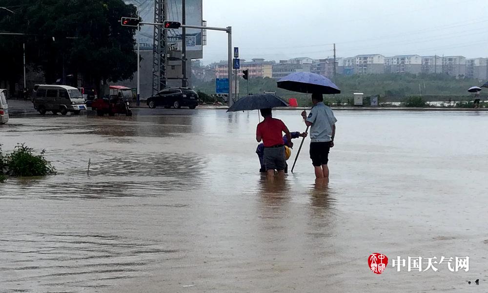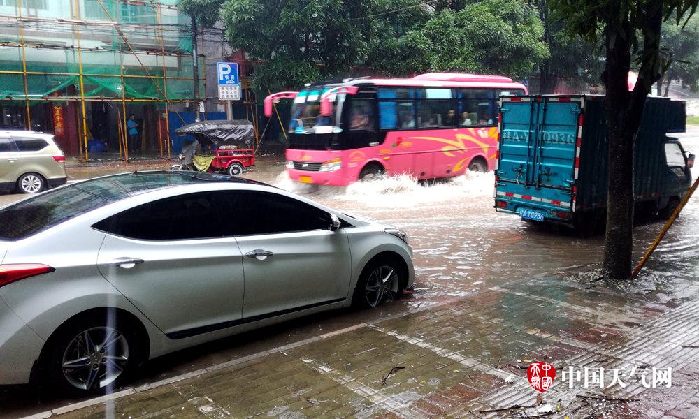 24日早上,上林县城内涝,班车淌水行进(摄影:上林气象信息员)