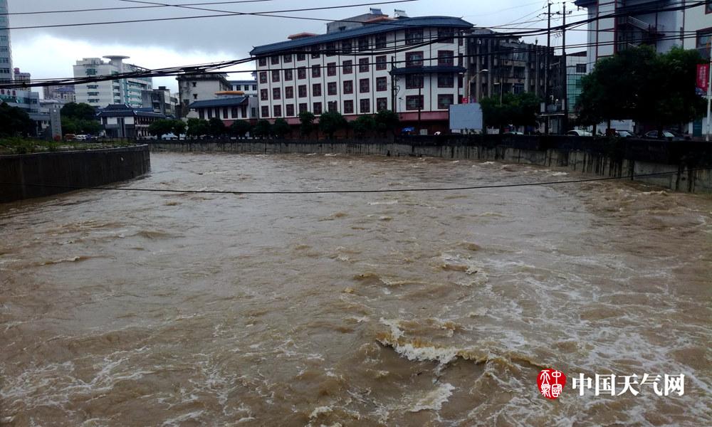 24日早上,澄江河上林县城段水位迅猛,河水湍急(摄影:上林气象信息员)