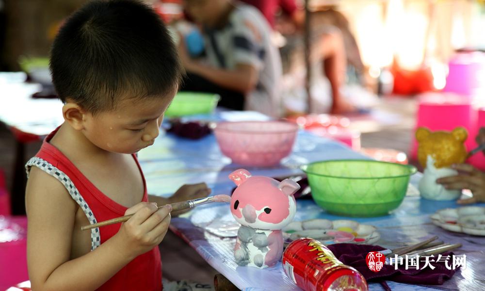 虽然满头汗珠小小艺术家仍认真创作(摄影:卢威旭)