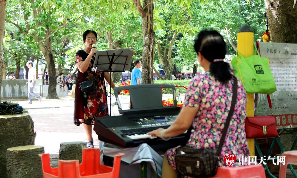 树荫下的小小演唱会,一个人弹奏,一个人演唱(摄影:卢威旭)