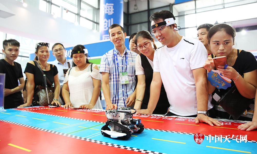 先进科技展馆里,参展商向市民展示脑电波机器人,戴上感应器就可控制机器人移动(摄影:刘英轶)