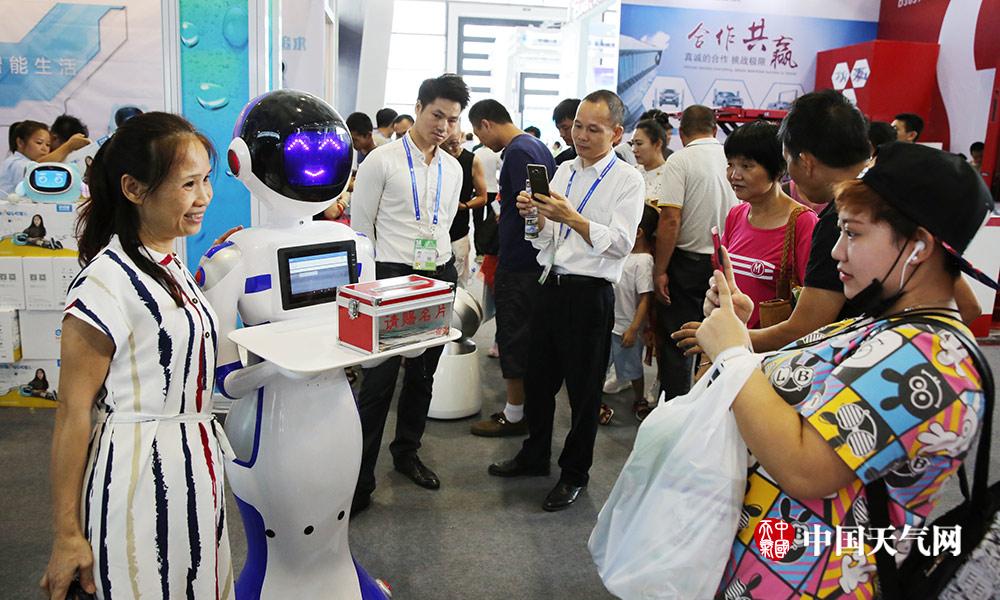 参展商来带的智能机器人很受青睐,市民纷纷与之合影留念(摄影:刘英轶)
